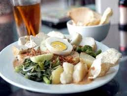 3. Siapkan pinggan,tata sayuran,tahu,dan tempe. Tuangkan bumbu kacang atau sajikan terpisah,taburi bawang goreng. Lengkapi dengan telur rebus dan emping goreng, sajikan.